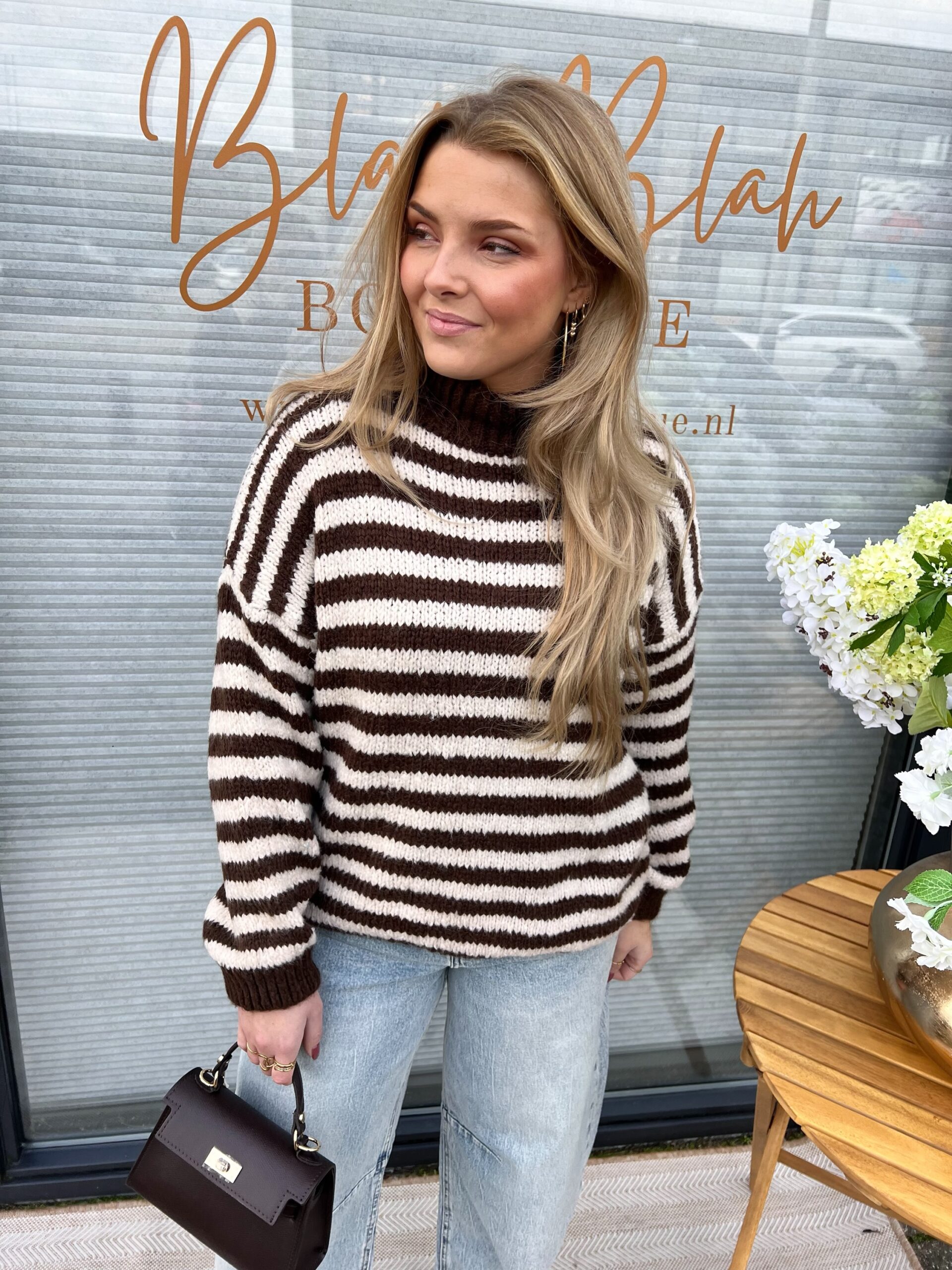Deze zachte gestreepte knit heeft een comfy fit en een hoge col voor een warme, cozy look. De bruine-met-crème strepen geven ’m een frisse maar toch winterse uitstraling. Perfect te dragen op een jeans of leren broek.