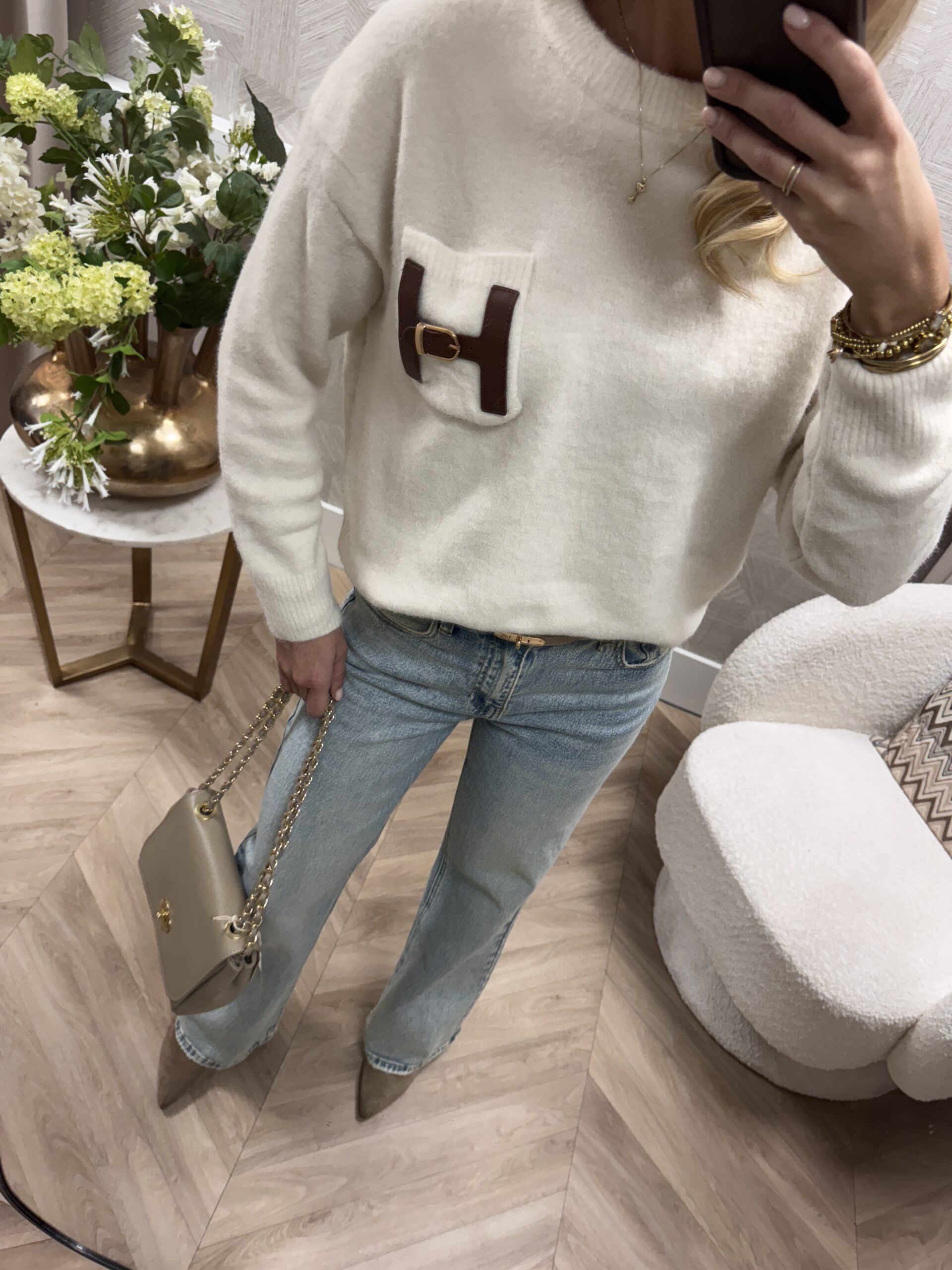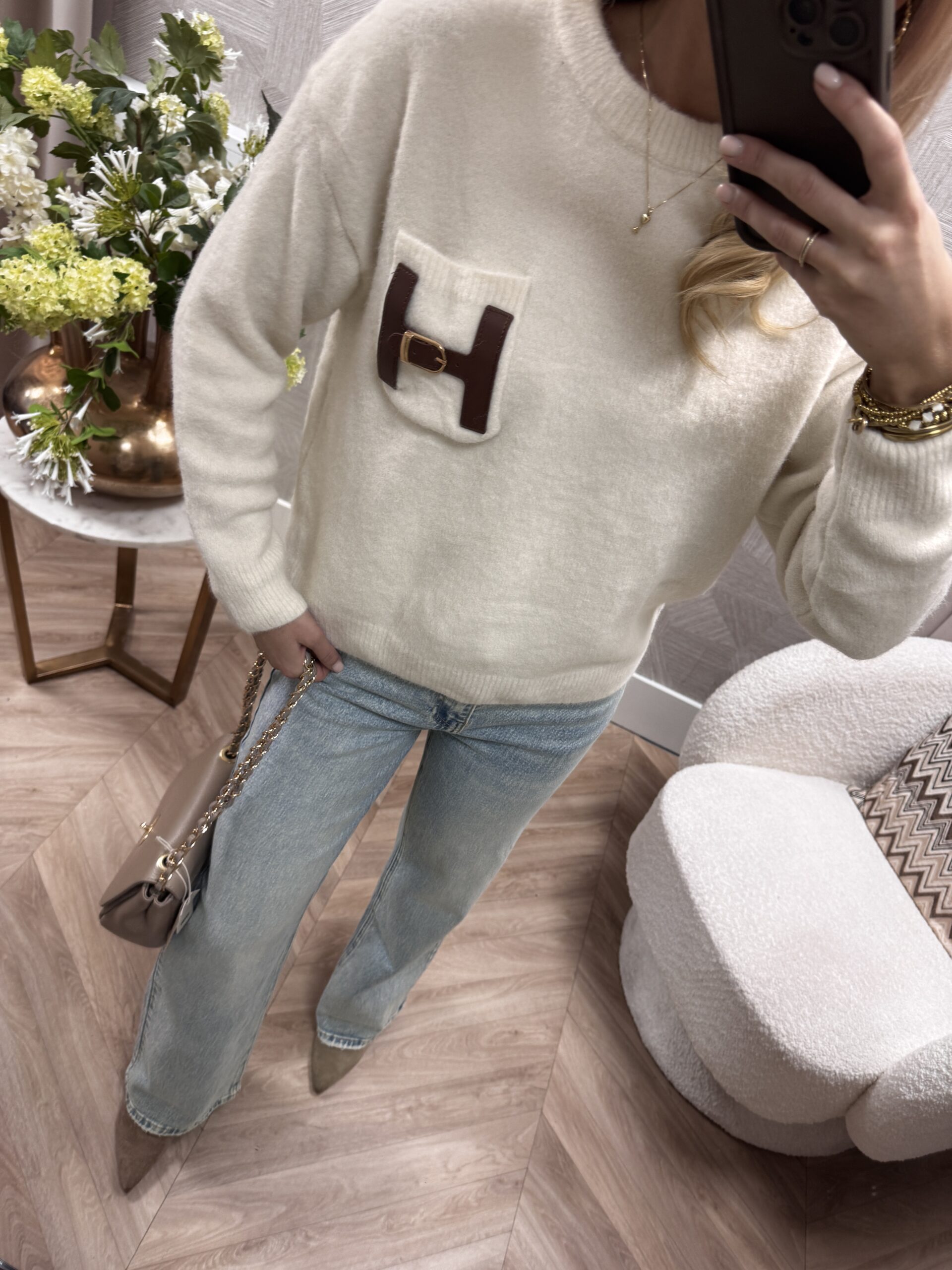 Deze gebreide trui geeft elke outfit direct een luxe touch dankzij het leren H-detail met gesp op de borst. De trui heeft een ronde hals, lange mouwen en een zachte, comfortabele knit.