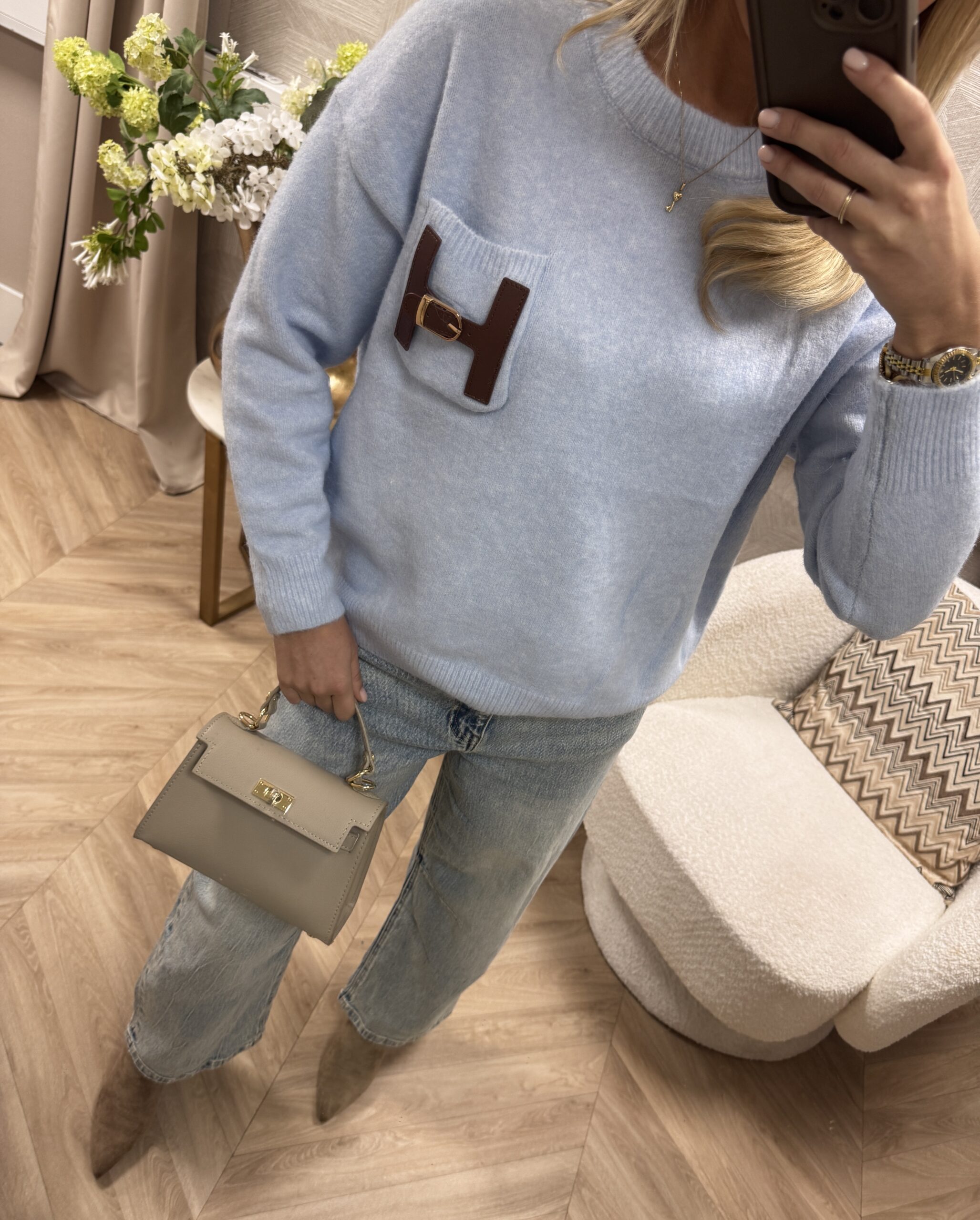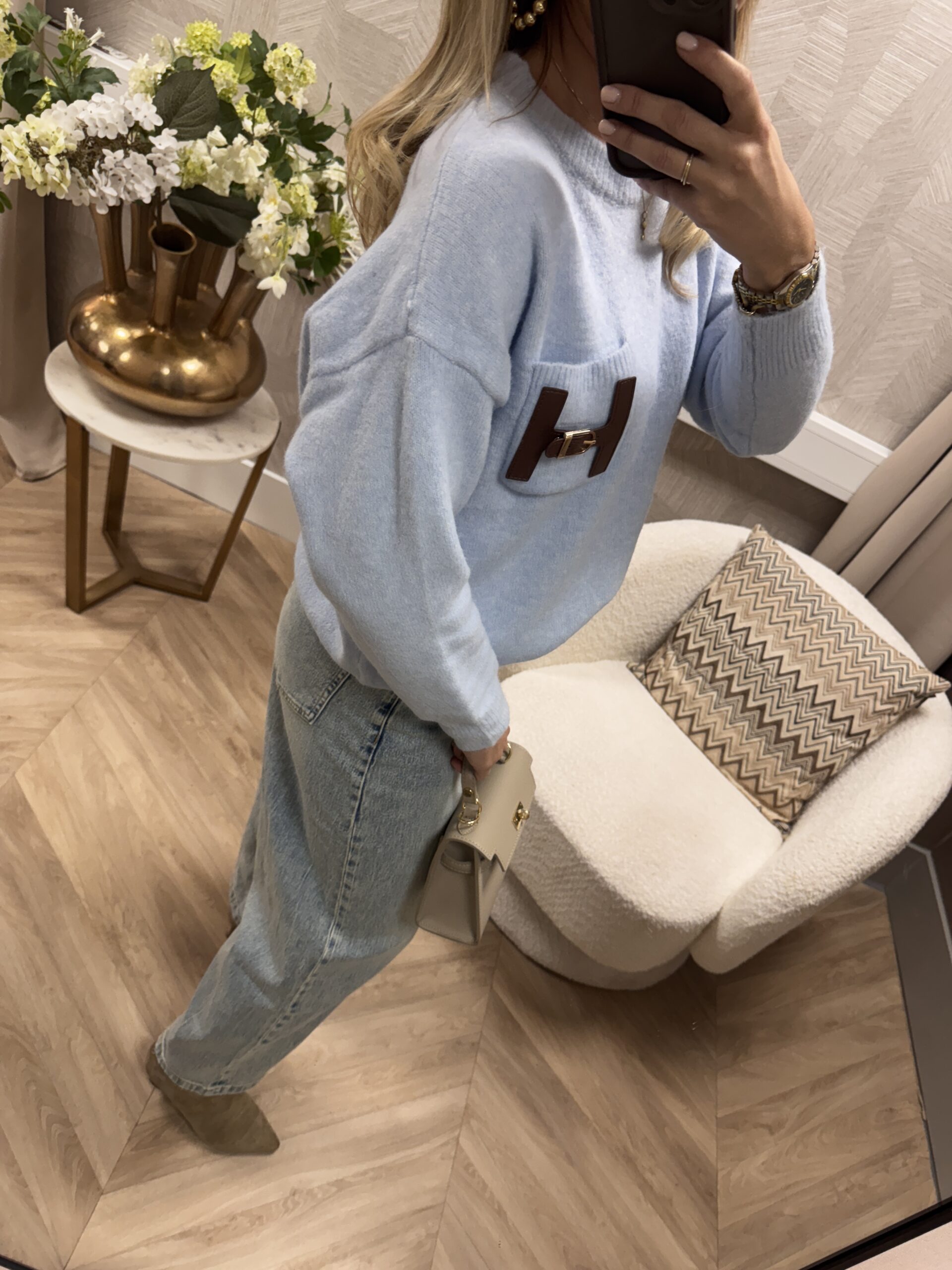 Deze gebreide trui geeft elke outfit direct een luxe touch dankzij het leren H-detail met gesp op de borst. De trui heeft een ronde hals, lange mouwen en een zachte, comfortabele knit.