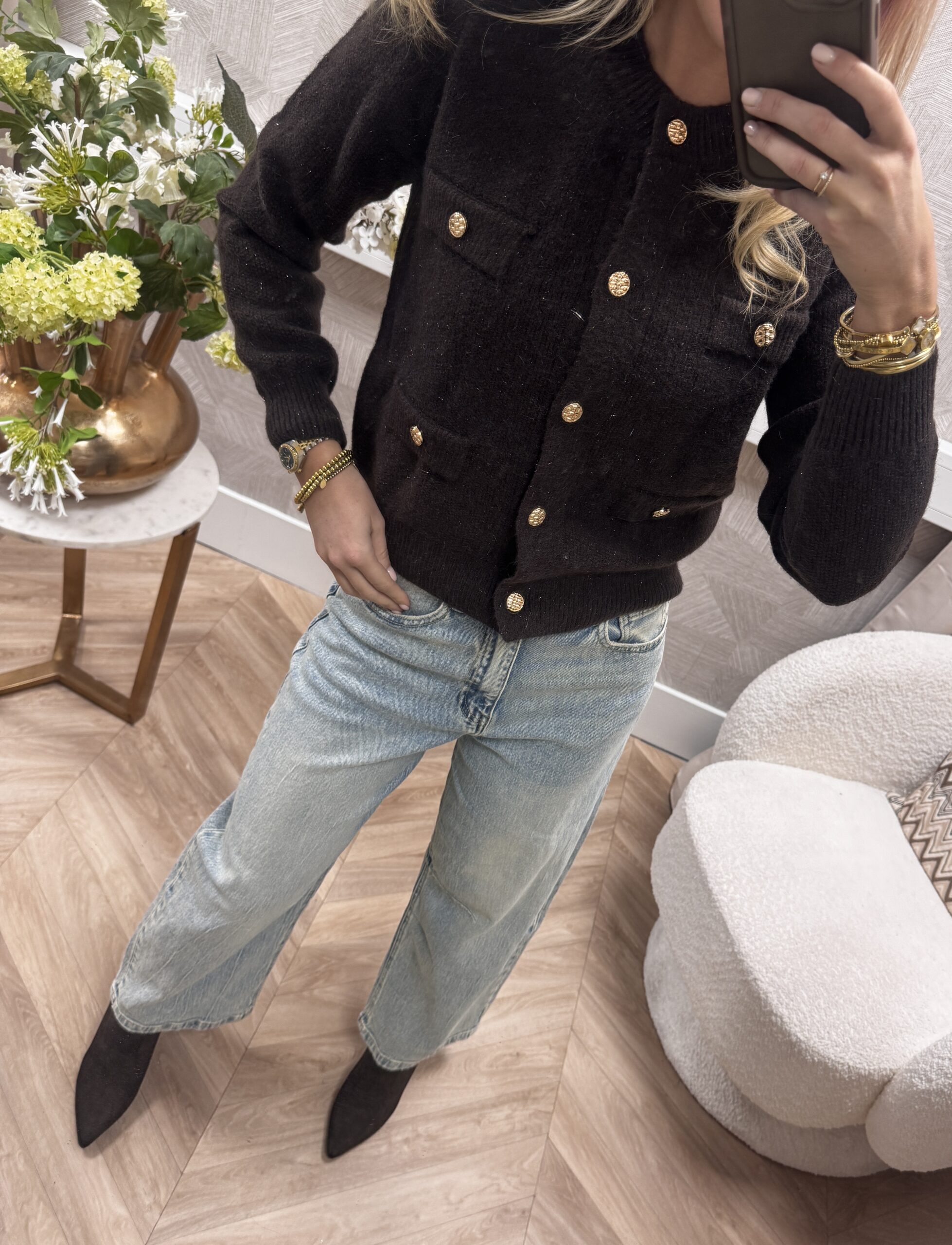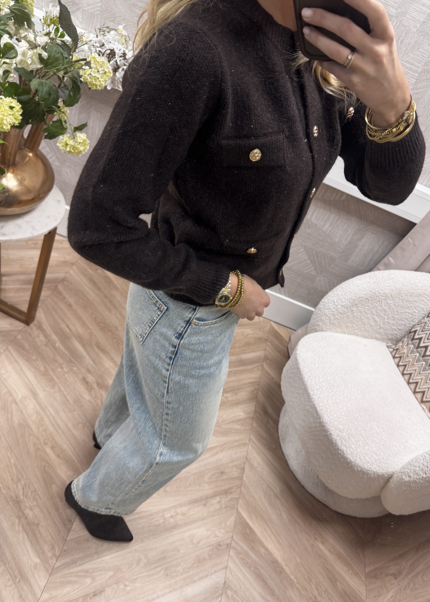 Chic en tijdloos – dit donkerbruine vest is een elegante toevoeging aan je garderobe. Het model is subtiel ingeweven met een glitterdraad en afgewerkt met luxe goudkleurige knopen voor een stijlvolle touch.