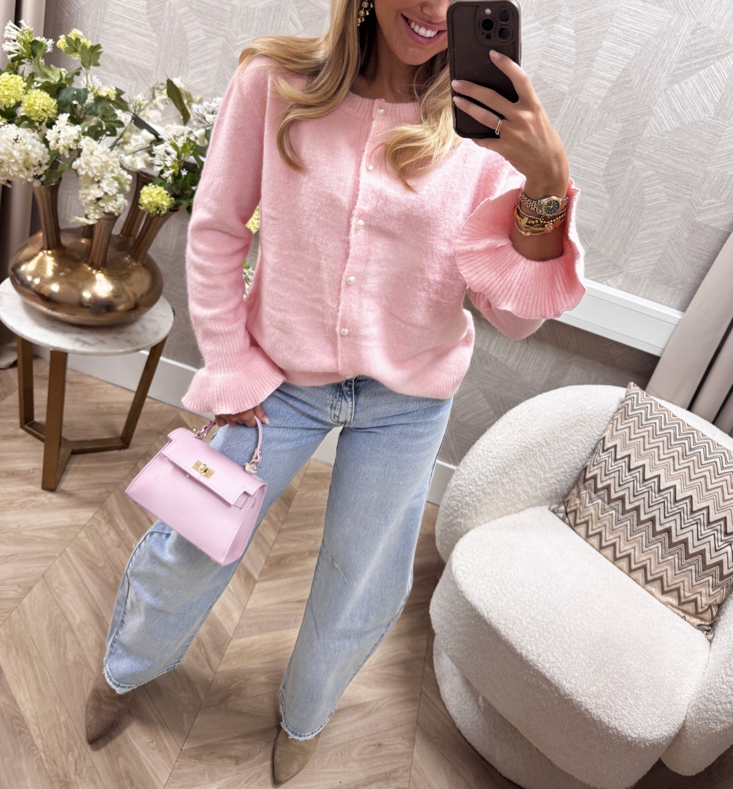 Dit zachte vestje is gemaakt van een fijne, comfortabele knit en heeft een aangesloten maar stretchy fit. De parel knoopsluiting en subtiele ruches aan de mouwen geven het vestje een vrouwelijke uitstraling.