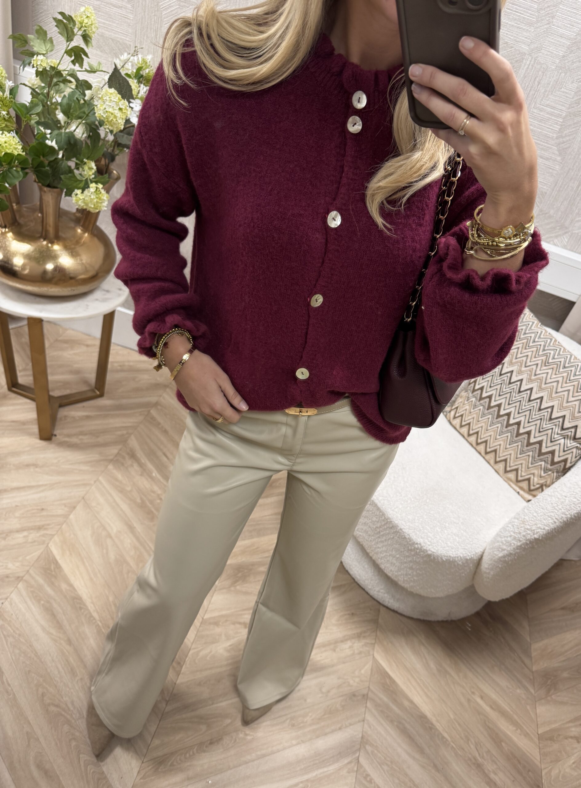 Het vest heeft een subtiel roezelkraagje en gerafelde mouwboorden, wat zorgt voor een speelse, elegante touch. De stof voelt heerlijk zacht aan en draagt comfortabel.