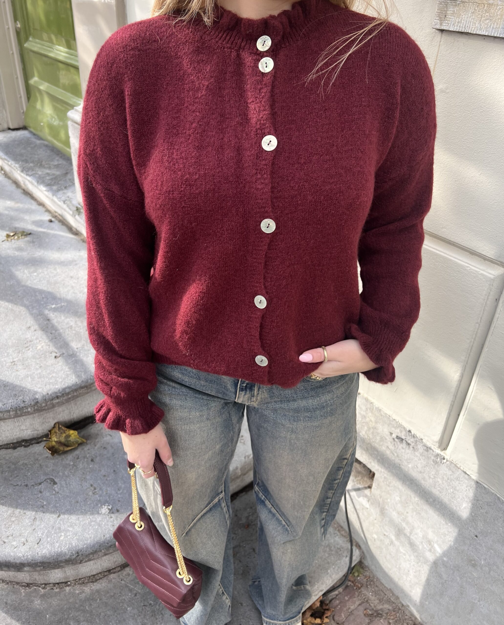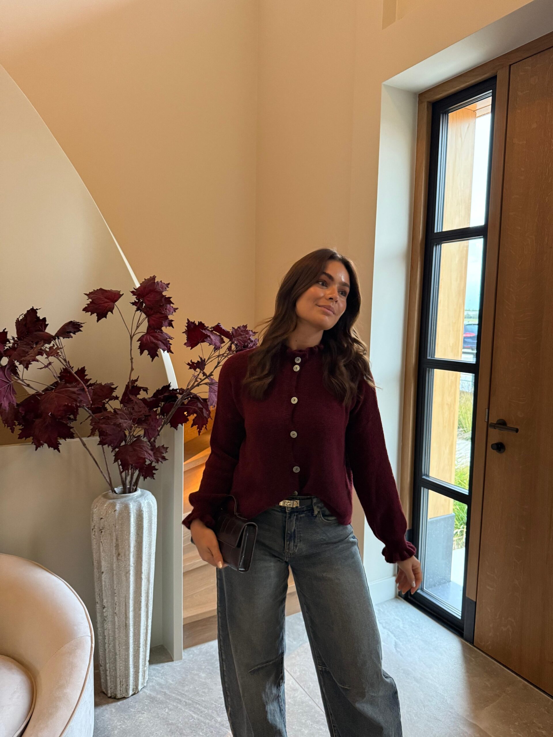 Het vest heeft een subtiel roezelkraagje en gerafelde mouwboorden, wat zorgt voor een speelse, elegante touch. De stof voelt heerlijk zacht aan en draagt comfortabel.