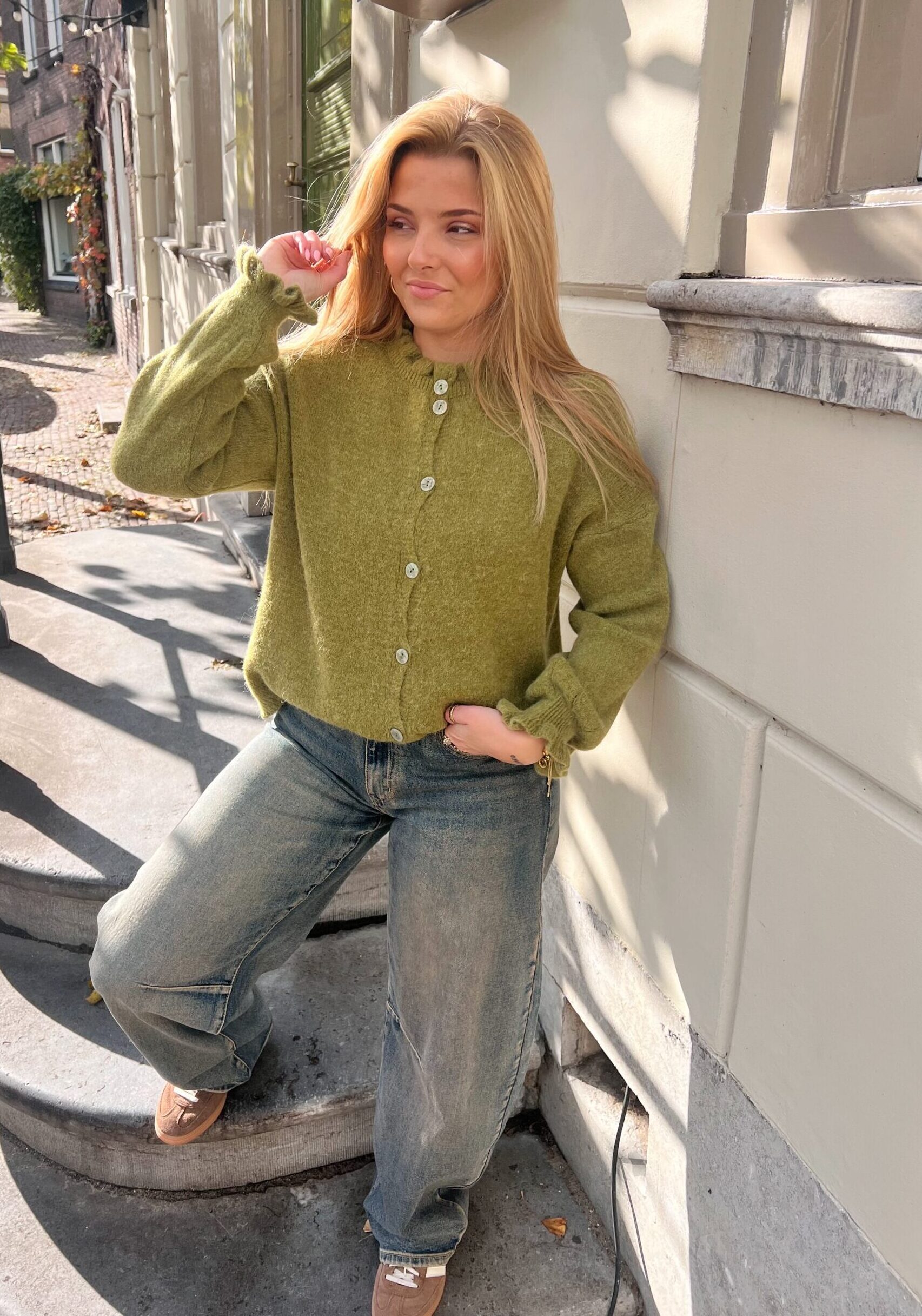 Het vest heeft een subtiel roezelkraagje en gerafelde mouwboorden, wat zorgt voor een speelse, elegante touch. De stof voelt heerlijk zacht aan en draagt comfortabel.