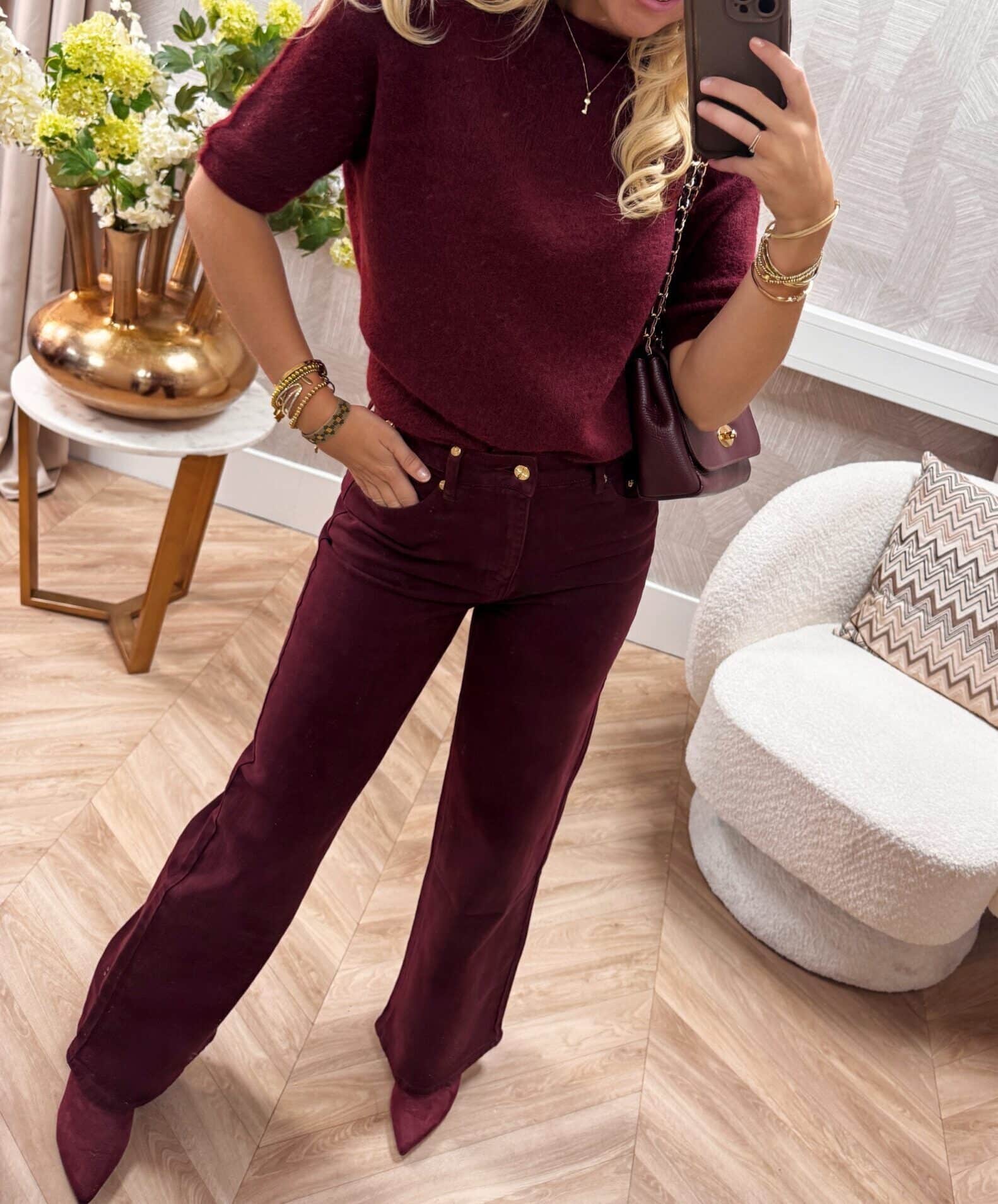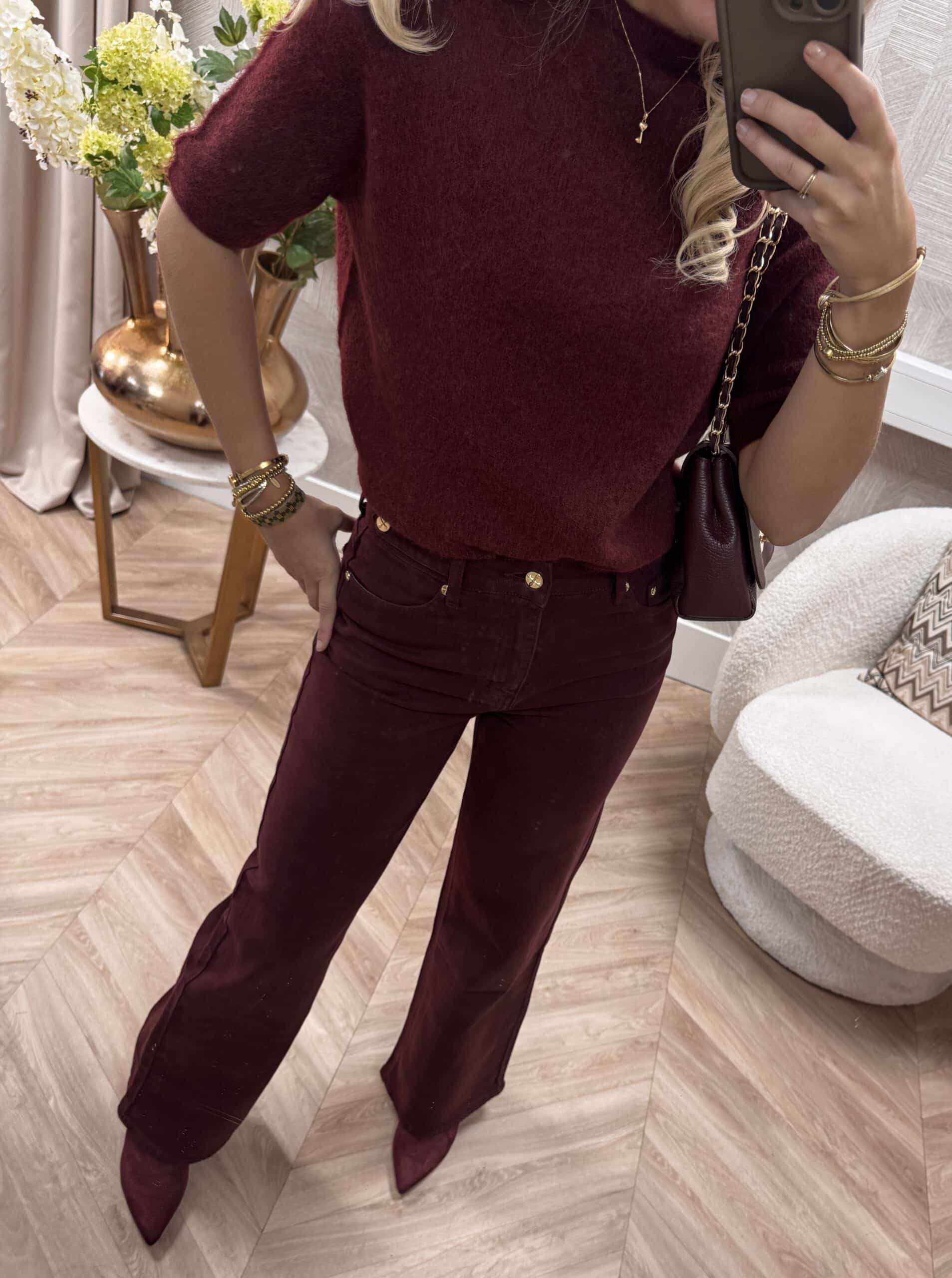 Deze bordeaux Queen Heart jeans is een echte musthave! Het wide leg model geeft een moderne en elegante uitstraling, terwijl de hoge taille zorgt voor een mooie pasvorm. De zachte stretchstof maakt de broek comfortabel en vrouwelijk, ideaal voor zowel casual als chique looks. Afgewerkt met goudkleurige details voor een luxe touch.