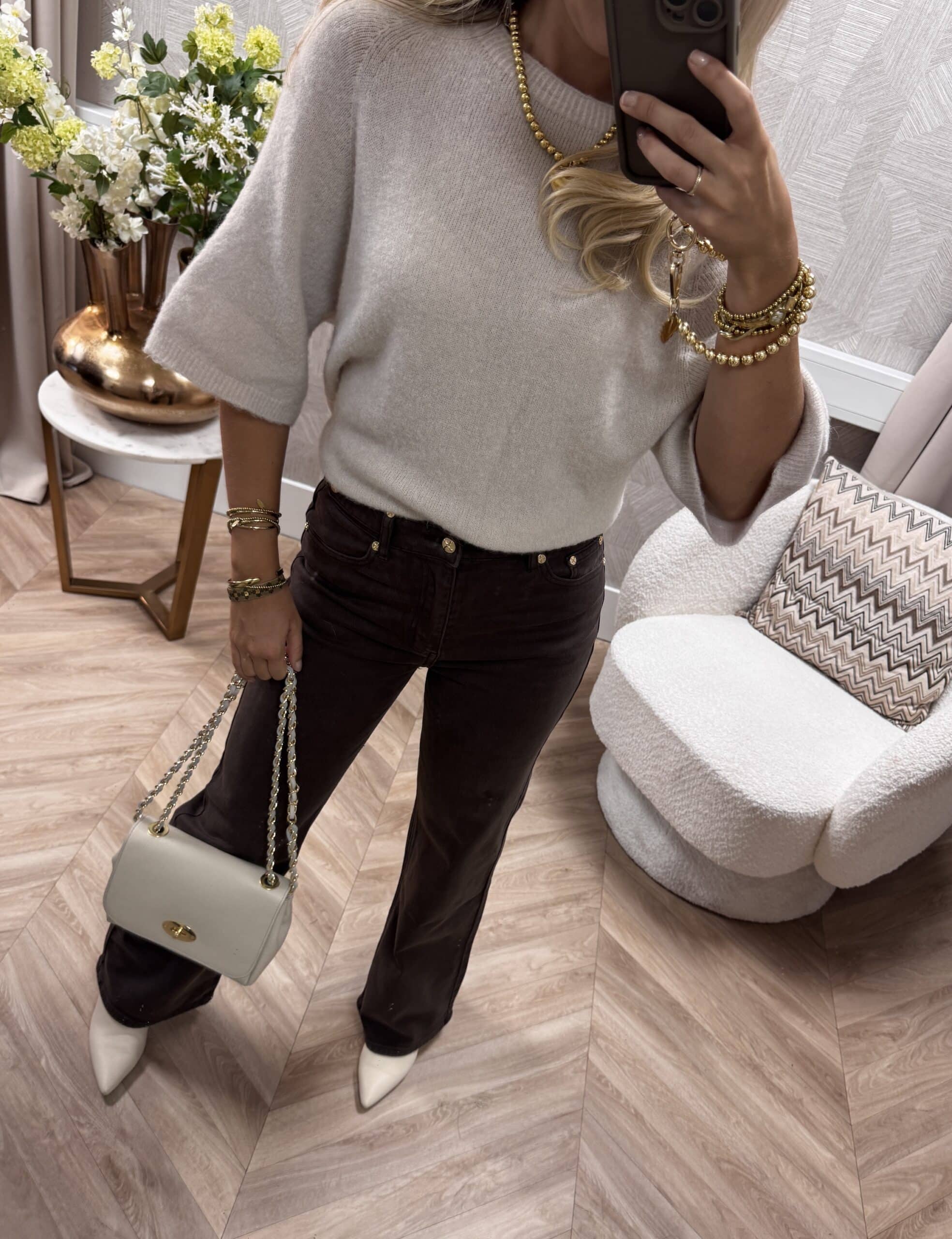 Deze donkerbruine Queen Heart jeans is een echte musthave! Het wide leg model geeft een moderne en elegante uitstraling, terwijl de hoge taille zorgt voor een mooie pasvorm. De zachte stretchstof maakt de broek comfortabel en vrouwelijk, ideaal voor zowel casual als chique looks. Afgewerkt met goudkleurige details voor een luxe touch.