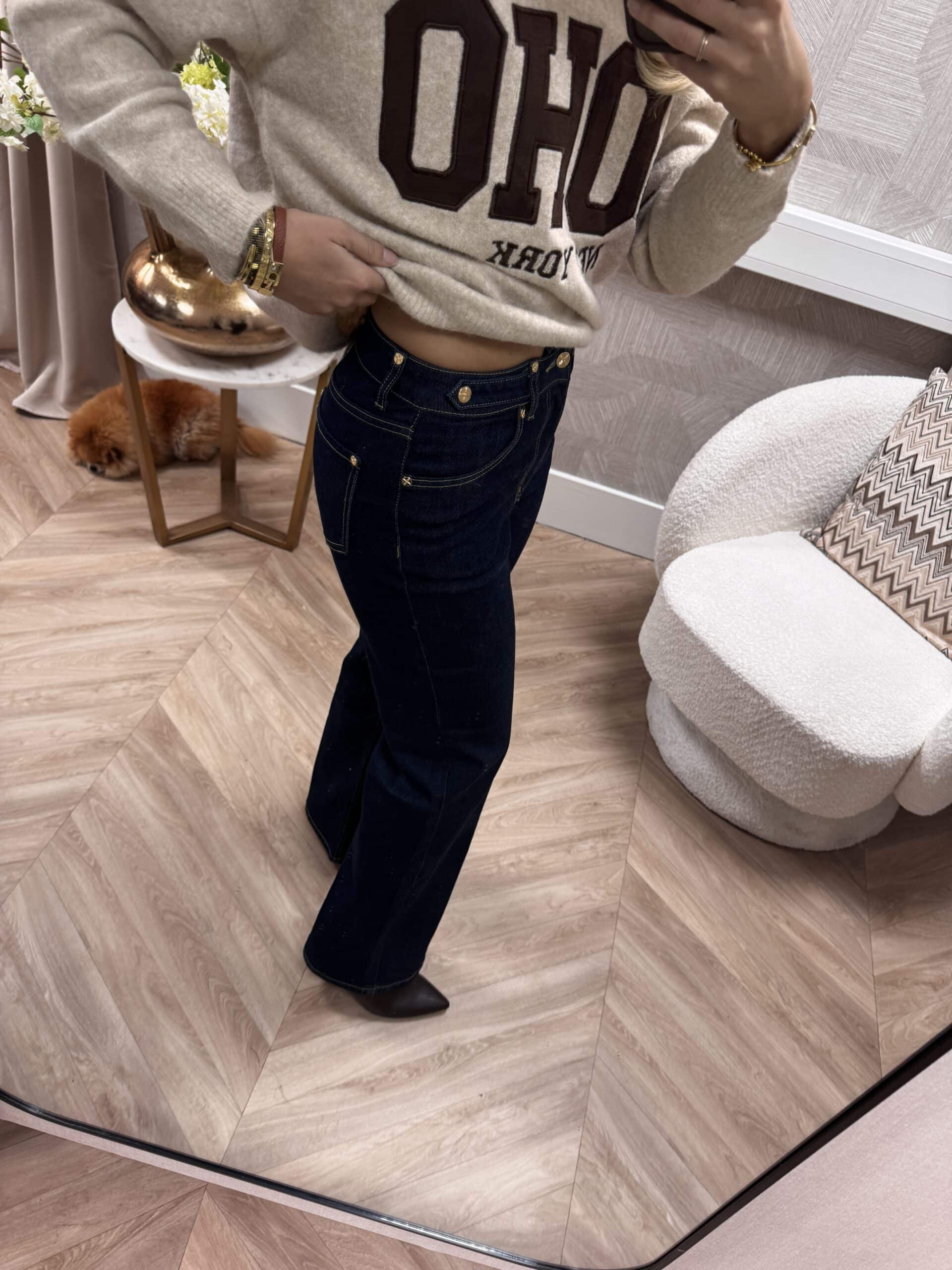 Deze Queen Heart jeans is een echte musthave! Het wide leg model geeft een moderne en elegante uitstraling, terwijl de hoge taille zorgt voor een mooie pasvorm. De zachte stretchstof maakt de broek comfortabel en vrouwelijk, ideaal voor zowel casual als chique looks. Afgewerkt met goudkleurige details voor een luxe touch.